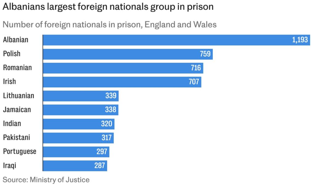 Albanians – who account for a disproportionate number of drug offences – remain the largest foreign national group in prison with 1,193 inmates, although this is down from the 2023 peak of 1,475. They are followed by Poles (759), Romanians (716), Irish (707), Lithuanians (339) and Jamaicans (338).