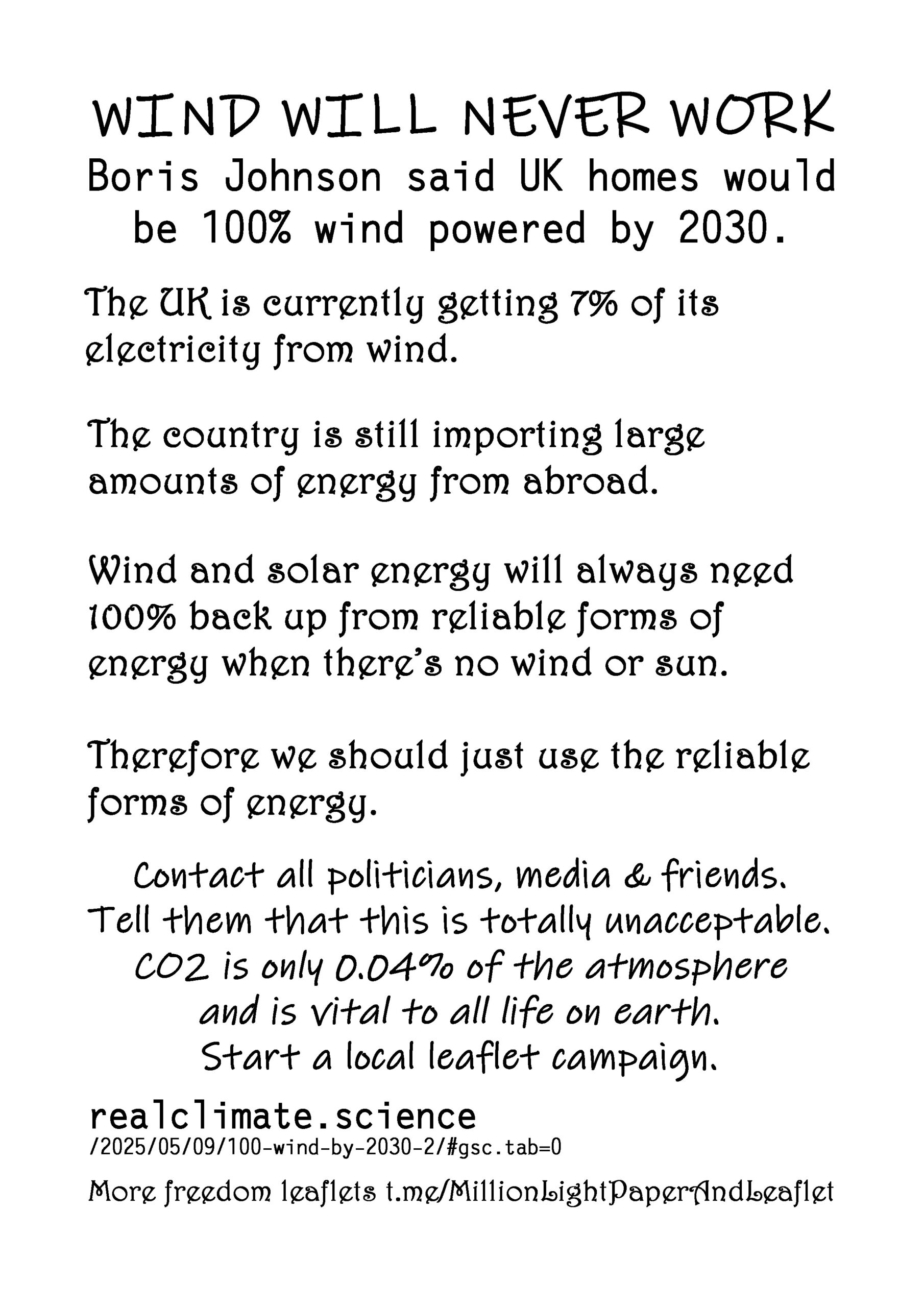 Wind Will Never Work – latest leaflet to print at home, deliver to neighbours, forward to your bad MP & friends online. Start a local leaflet campaign. Deliver 100 leaflets a week (5200 a year). Over 300 leaflet ideas on the link on the leaflet.