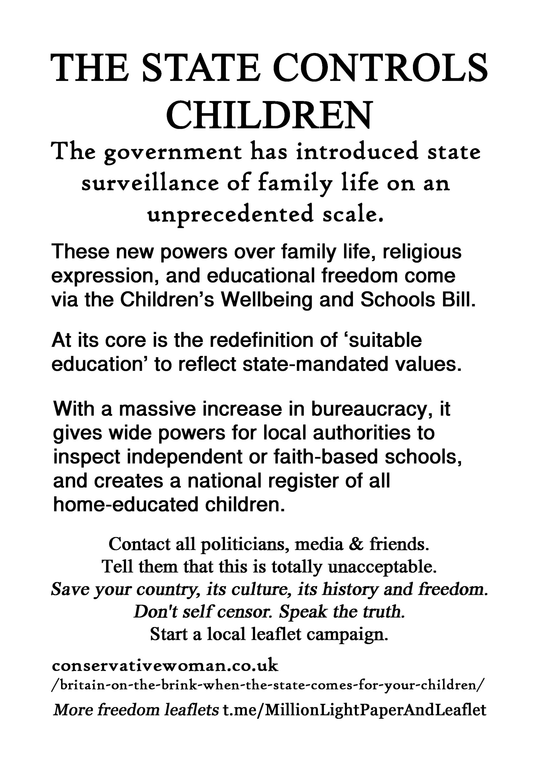 The State Controls Children – latest leaflet to print at home, deliver to neighbours, forward to your bad MP & friends online. Start a local leaflet campaign. Deliver 100 leaflets a week (5200 a year). Over 300 leaflet ideas on the link on the leaflet.