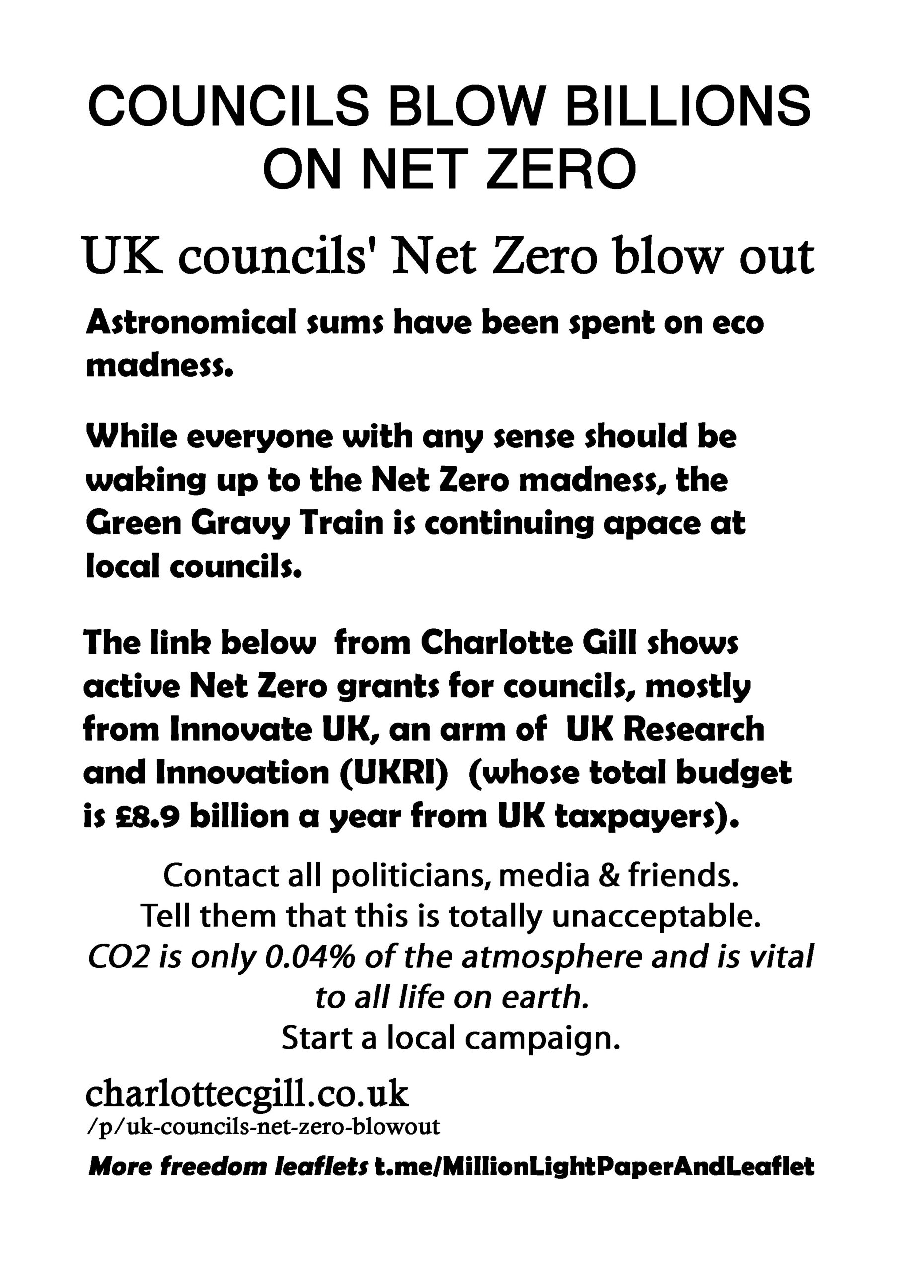 Councils Blow Billions On Net Zero – latest leaflet to print at home, deliver to neighbours, forward to your bad MP & friends online. Start a local leaflet campaign. Deliver 100 leaflets a week (5200 a year). Over 300 leaflet ideas on the link on the leaflet.