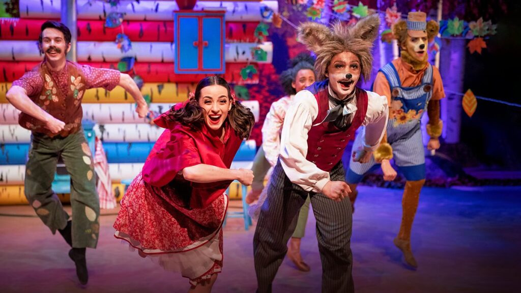 In Little Red Riding Hood, we see “Little Red” going to visit her grandmother with a basket of treats, as in the original. And, sure enough, we discover that there is a wolf lurking in the forest. But he is curiously un-wolf-like. With bunny-like ears and a fluffy tail he looks more like a fox, and his behaviour is flighty, cowardly, almost effete. And we quickly find out that he has no interest in eating “Little Red” or her grandmother or anybody else. Arriving at grandma’s house, he sneaks inside in search of honey and hides under her bed. When the old lady goes off for a nice hot bath, he then comes out of hiding to raid her kitchen. But he is spooked by the arrival of “Little Red”. Quickly, he puts on grandma’s clothes and glasses as an improbable disguise and dives under the bed covers.