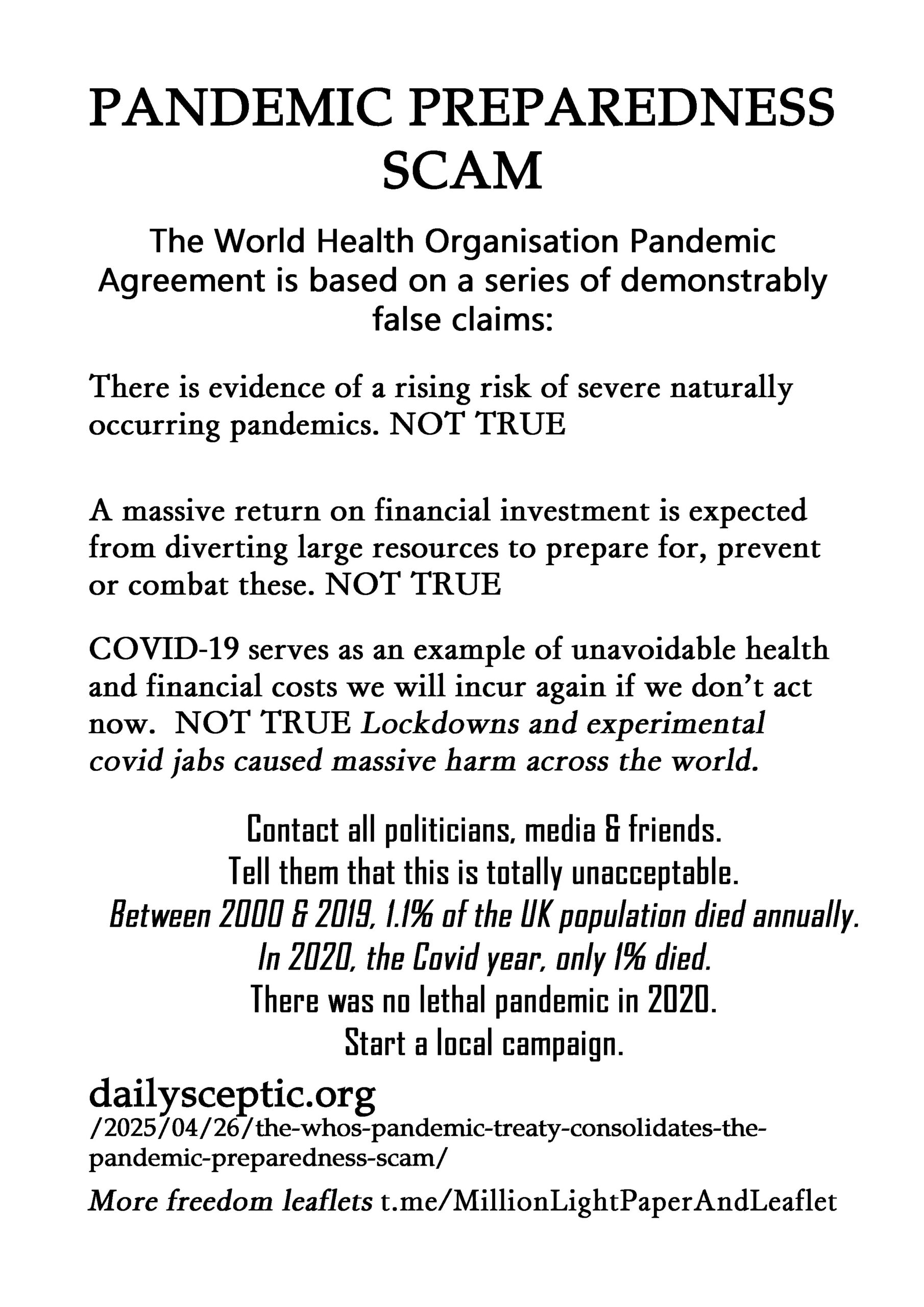 Pandemic Preparedness Scam – latest leaflet to print at home, deliver to neighbours, forward to your bad MP & friends online. Start a local leaflet campaign. Deliver 100 leaflets a week (5200 a year). Over 300 leaflet ideas on the link on the leaflet.
