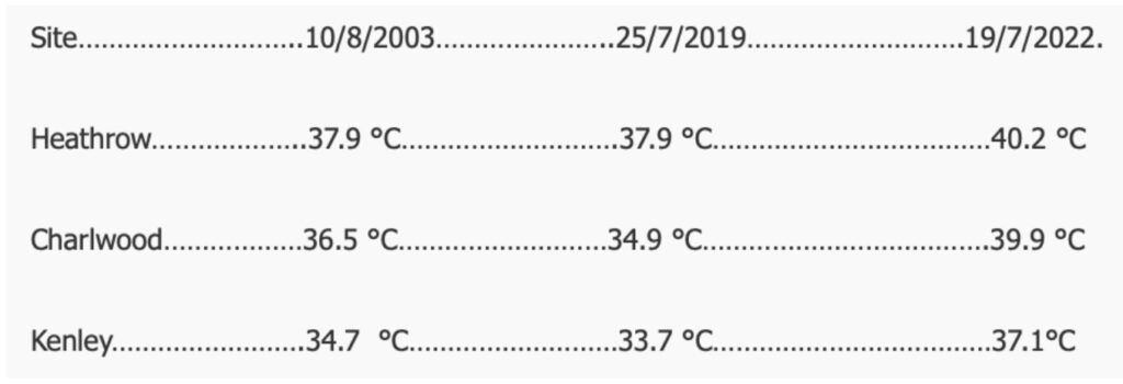 Needless to say, nobody can recall Kenley troubling the scorers over at the “extreme” temperature competition. Unbelievably, or risibly as Sanders observes, both Charlwood (Gatwick) and Heathrow are given a better Class 3 rating, and this prompted him to compare the highest temperatures recorded at the last three national record-breaking days.