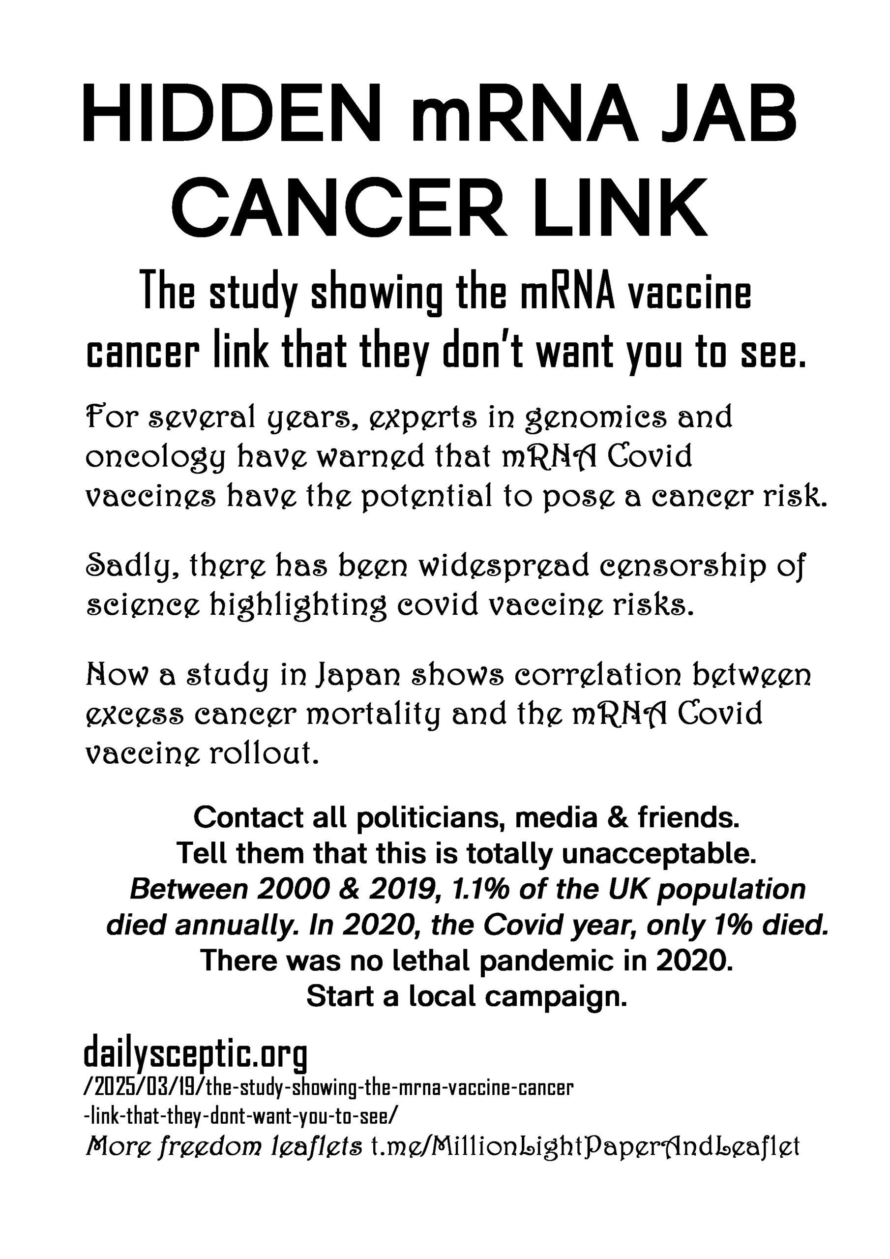 Hidden mRNA Jab Cancer Link – latest leaflet to print at home, deliver to neighbours, forward to your bad MP & friends online. Start a local leaflet campaign. Deliver 100 leaflets a week (5200 a year). Over 300 leaflet ideas on the link on the leaflet.