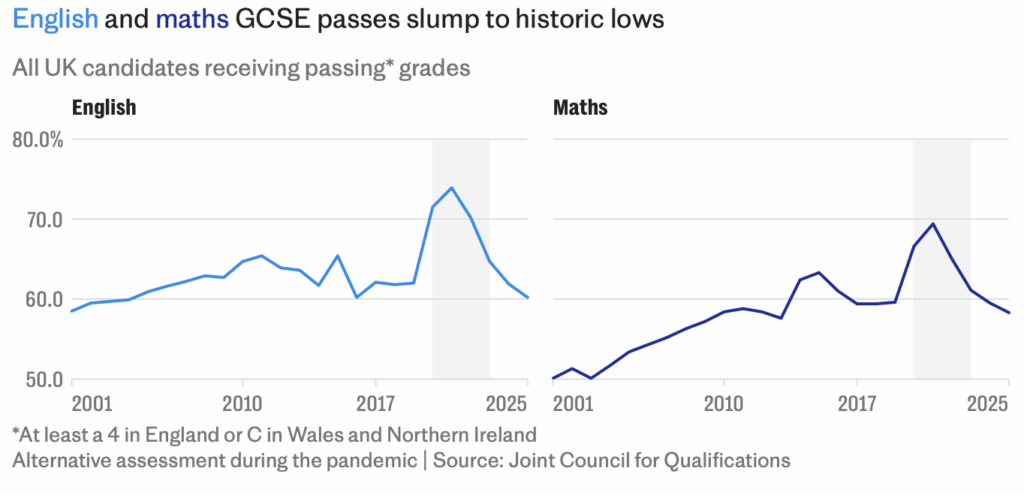 Today’s results means two in five pupils are now failing the two compulsory GCSE subjects, despite most jobs requiring applicants to prove that they passed them.