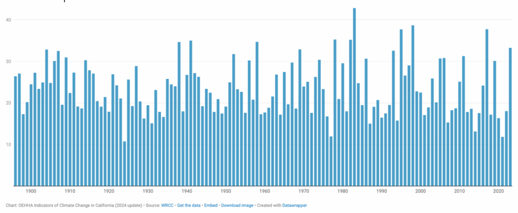 Written by recent graduate trainee Tim Sigsworth, the story reports that the Derbyshire delicacy is now being produced without almonds by some makers “because of supply chain problems linked to global warming”. Supplies are said to be under strain due to heat and drought episodes. In fact, water droughts are intrinsic to the climate in California, particularly in the near-desert south of the state. Overall rainfall can be patchy, with droughts alternating with plentiful precipitation that quickly fills up reservoirs. In addition, annual snow melt provides a variable but important base level. As the precipitation graph measured in annual inches shows below, the 20th and early 21st Centuries had numerous short-term droughts. However, they might be considered somewhat wet compared with the paleoclimate record over the last millennium. This reveals two mega droughts that were each well over 100 years long. Longer term records reveal that decade-long droughts are an ordinary feature of California’s climate. On the evidence available, there is scant scientific proof to link current rainfall trends to recent warming or climate change, human-caused or otherwise.