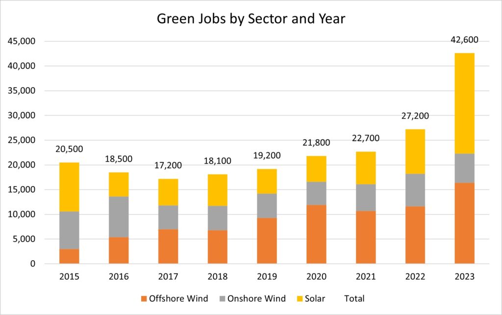 In the renewable energy sector, the number of full-time equivalent jobs in the UK for offshore wind, onshore wind and solar was 16,400, 5,900 and 20,300, respectively. As shown in Figure 1, the number of jobs in these sectors rose substantially in 2023.