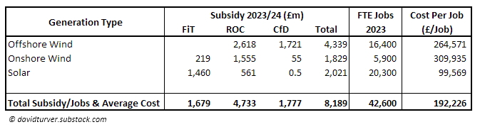We can see that each offshore wind job cost £264,000 in subsidy, each onshore wind job cost over £309,000 and solar nearly £100,000. The average across all three sectors is over £192,000 per job.