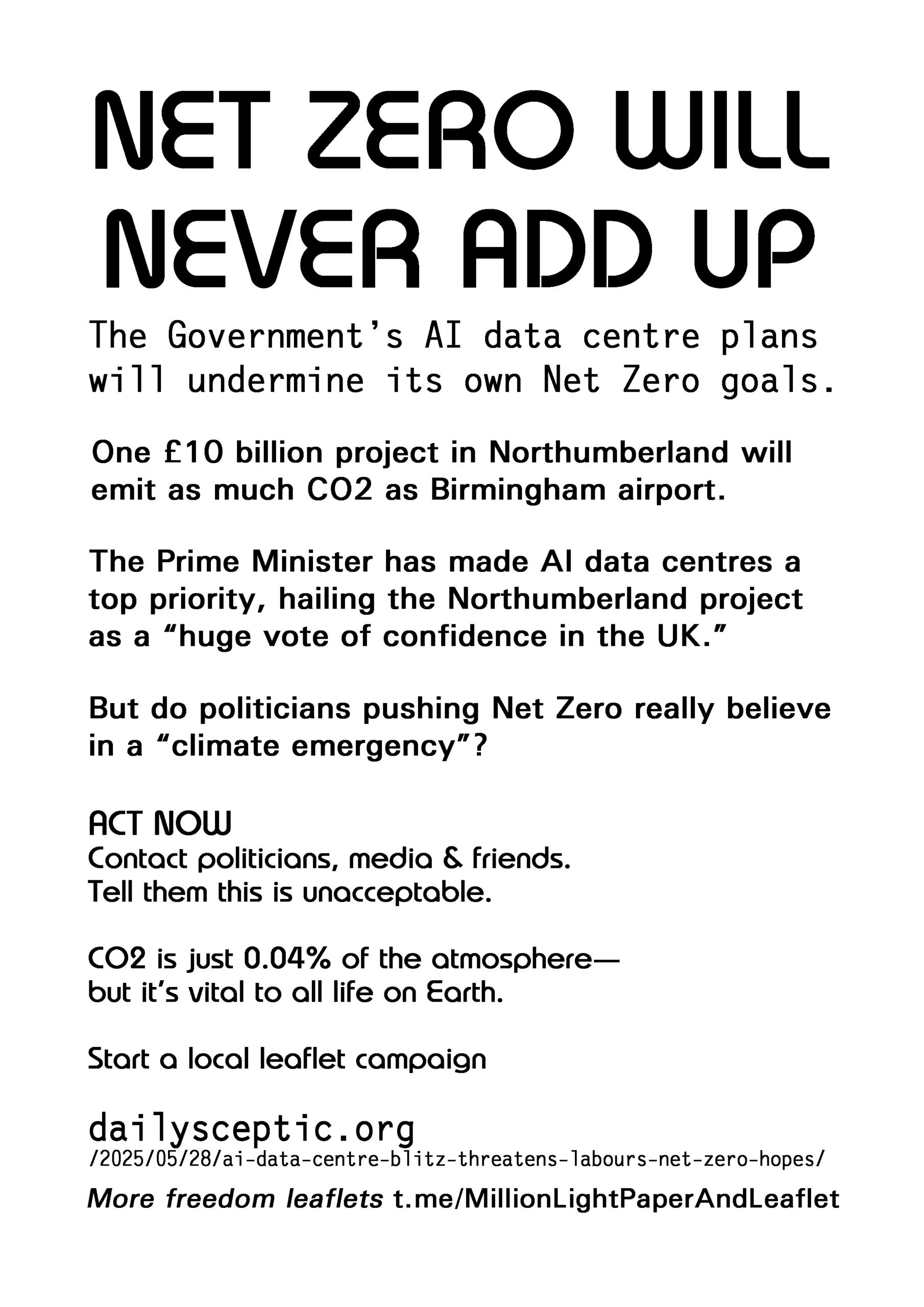 Net Zero Will Never Add Up latest leaflet to print at home, deliver to neighbours, forward to your bad MP & friends online. Start a local leaflet campaign. Deliver 100 leaflets a week (5200 a year). Over 300 leaflet ideas on the link on the leaflet.
