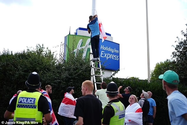 On Sunday afternoon, protesters in Birmingham were seen peering through the doors of the hotel and one was seen scaling a ladder to hang a flag on a lamp post by the Holiday Inn sign.