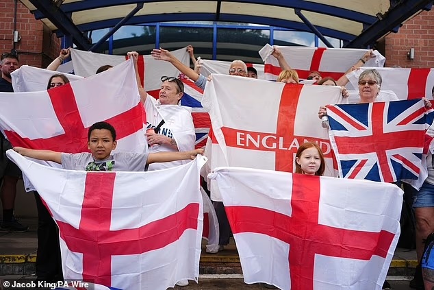 A group of protesters, some draped in the St George’s Cross, gathered outside the Castle Bromwich Holiday Inn in Birmingham on Sunday