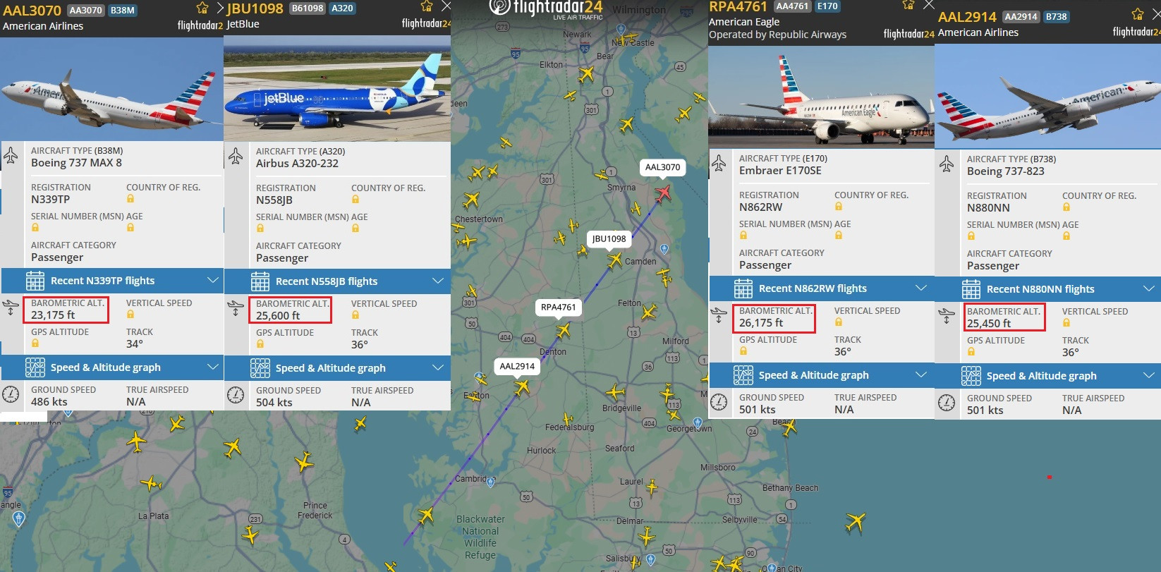 Notice that all 4 are at different altitudes and I can do the same almost anywhere on the planet. Give this website a go and watch aircraft over where you live. You will get about an hour for free, but clear out cache and cookies and you can get another hour.