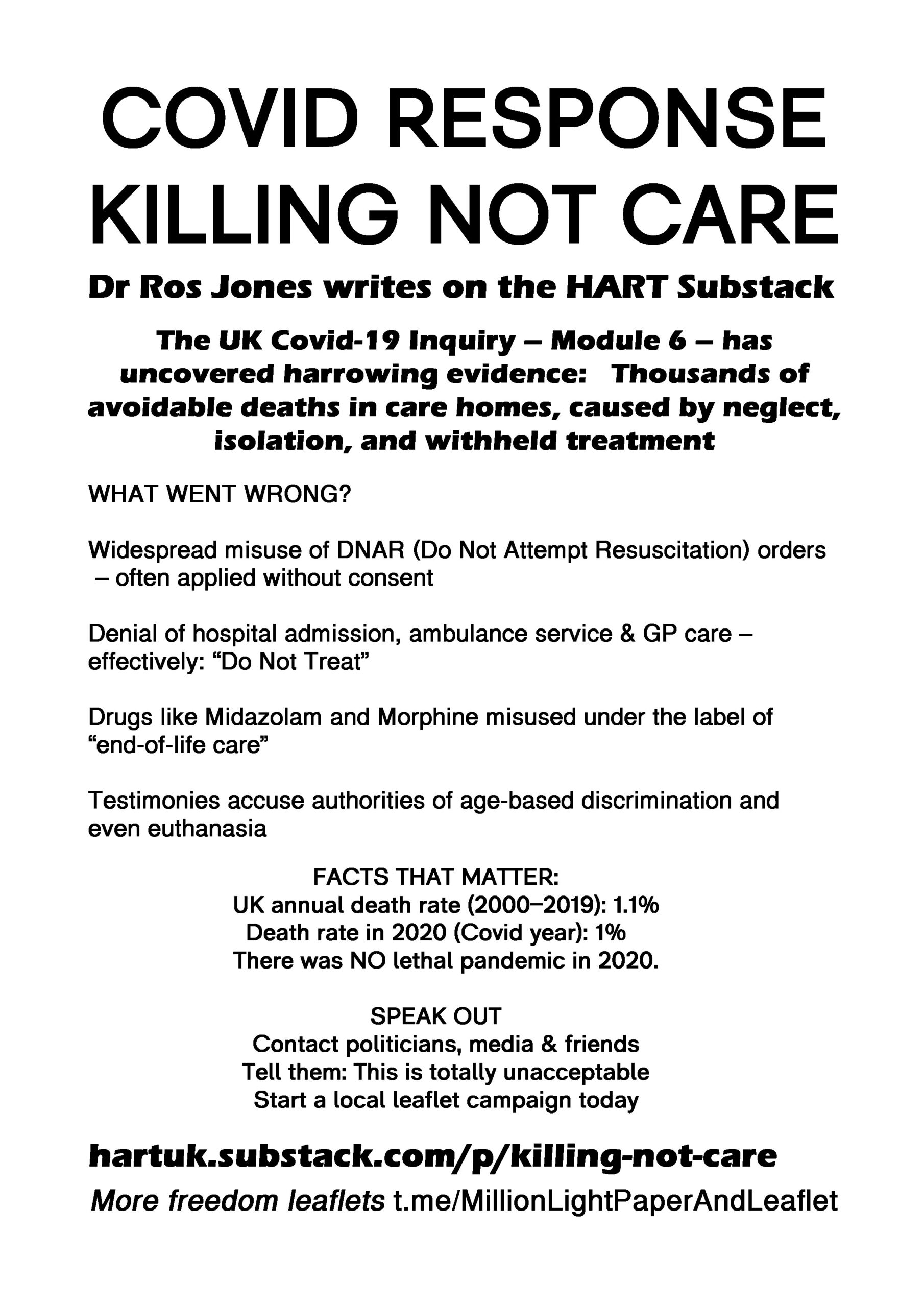 Covid Response Killing Not Care – latest leaflet to print at home, deliver to neighbours, forward to your bad MP & friends online. Start a local leaflet campaign. Deliver 100 leaflets a week (5200 a year). Over 300 leaflet ideas on the link on the leaflet.