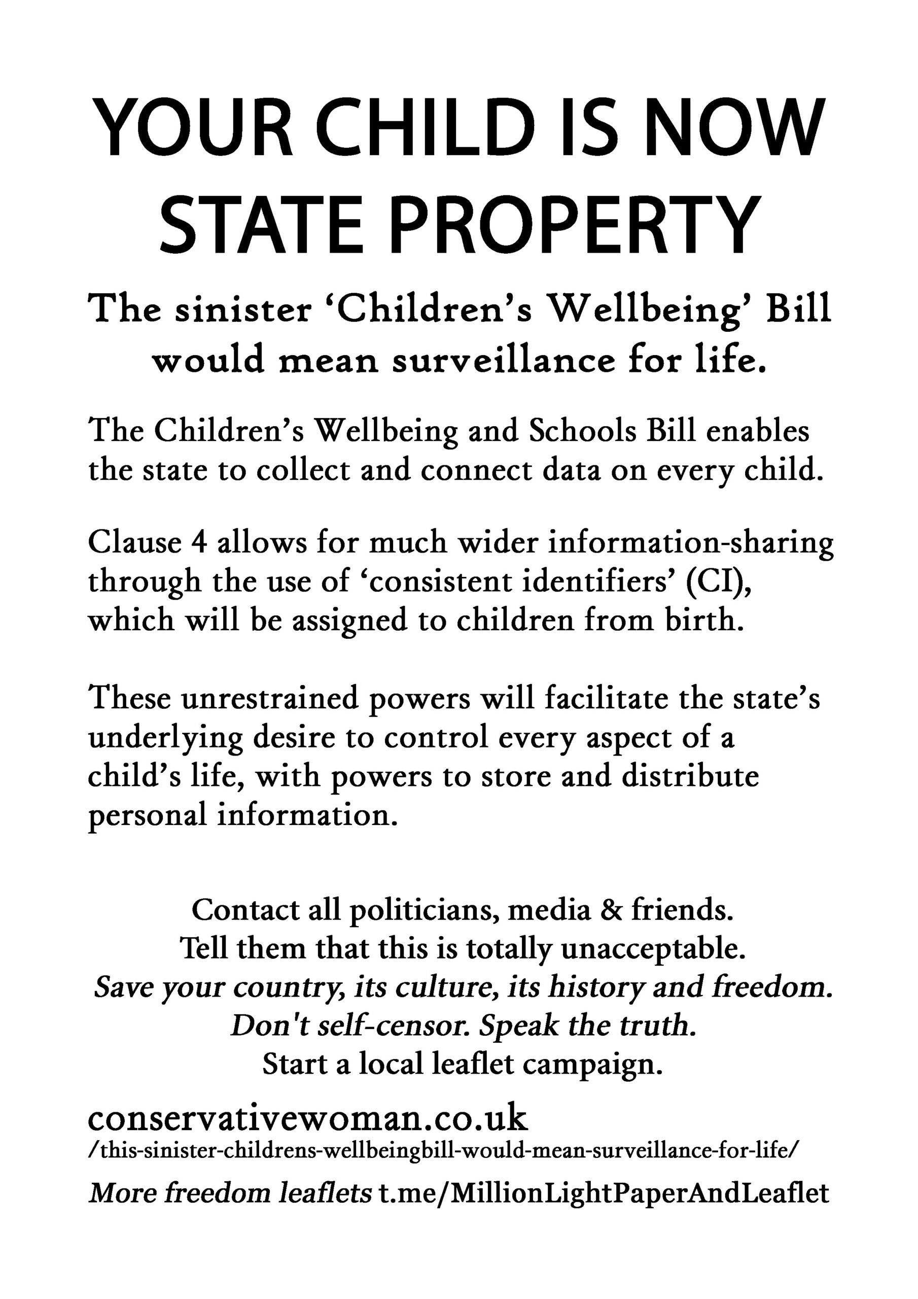 Your Child is Now State Property – latest leaflet to print at home, deliver to neighbours, forward to your bad MP & friends online. Start a local leaflet campaign. Deliver 100 leaflets a week (5200 a year). Over 300 leaflet ideas on the link on the leaflet.