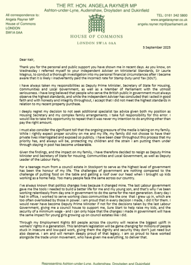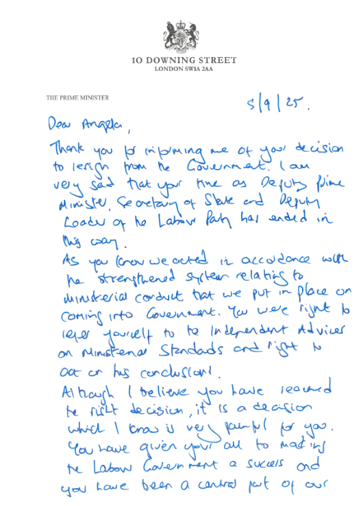 Ms Rayner is understood to be leaving her post as Deputy PM after Sir Laurie Magnus delivered his verdict to Keir Starmer.