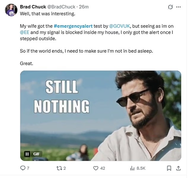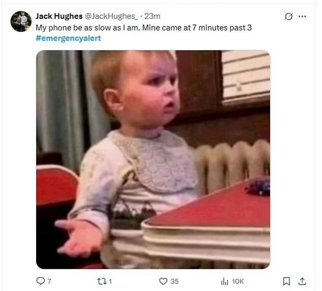 One person jibed on X at 3.09pm: “Well that emergency alert was six minutes late!! If it had been a nuclear alert I’d have had no time to hide under the table.”