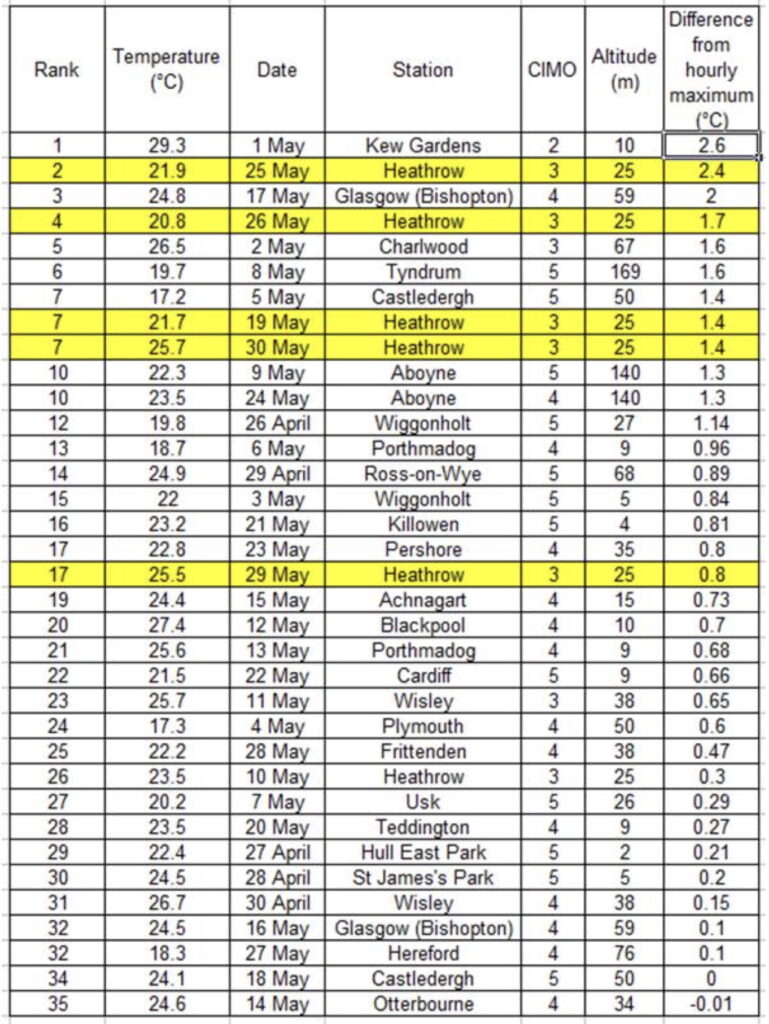 In his seminal work, Dr Eric Huxter opened a window on the possible extent to which 60-second recordings were collecting large numbers of unnatural heat spikes. On May 1st this year, the Met Office claimed that its station at Kew Gardens recorded a temperature of 29.3°C at 2.59pm. This was said to be the highest temperature ever recorded in the UK on May Day. But the temperature was an obvious outlier, since it was a massive 2.6°C higher than that seen at 2pm and no less than 0.76°C above the figure recorded a minute later at 3pm. Temperatures can move around from minute to minute, generally in the 0.1°C–0.3°C range. The Kew uplift was the highest observed, although ‘record’ favourite Heathrow was not far behind on numerous highlighted occasions, as the information below covering April 26th to May 30th shows.