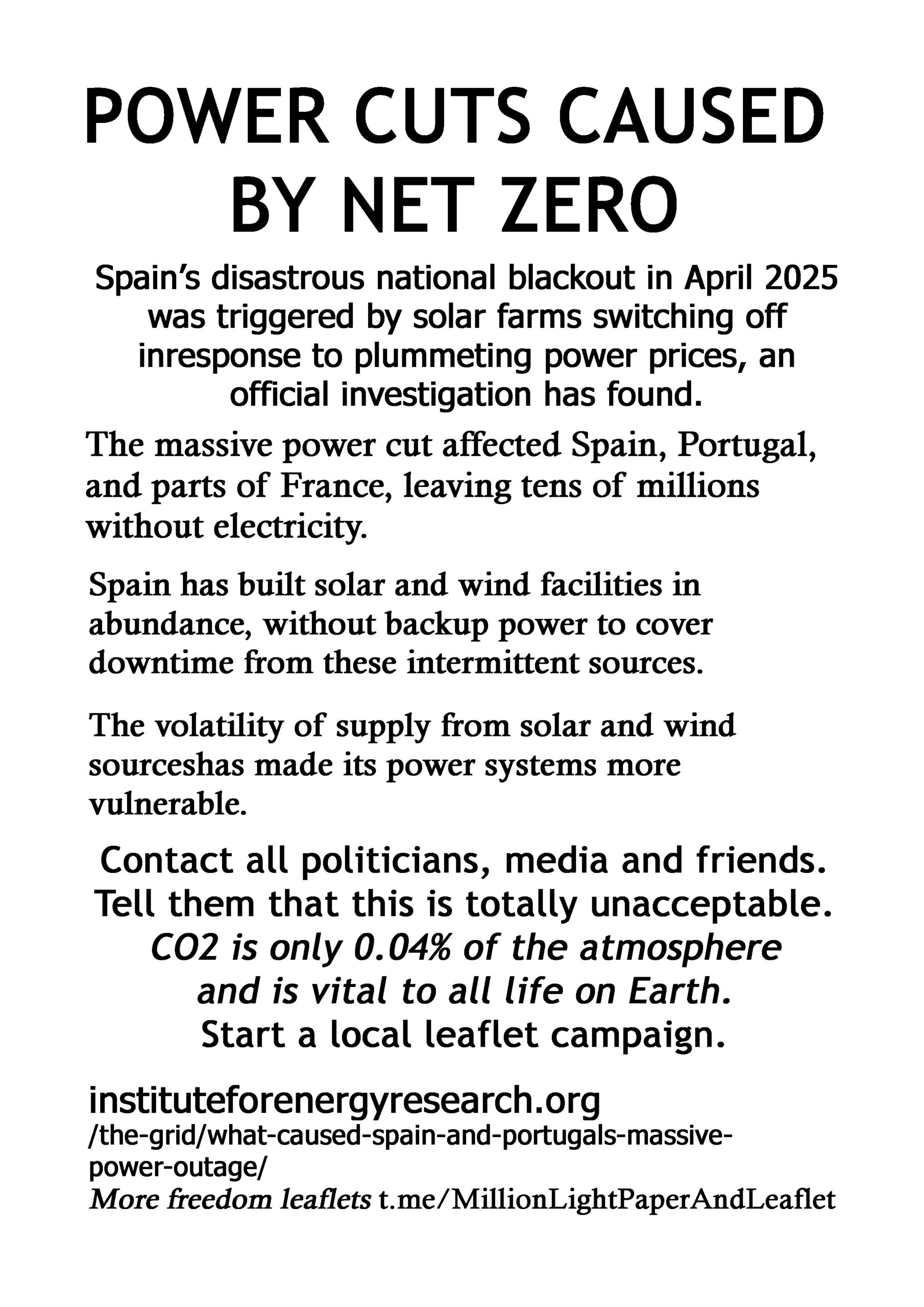 Power Cuts Caused By Net Zero – latest leaflet to print at home, deliver to neighbours, forward to your bad MP & friends online. Start a local leaflet campaign. Deliver 100 leaflets a week (5200 a year). Over 300 leaflet ideas on the link on the leaflet.