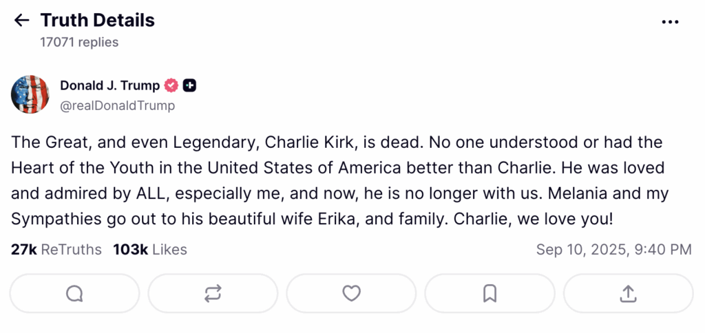 In a moment that has sent shockwaves across the world, Turning Point founder Charlie Kirk has been murdered while addressing a university audience in the United States. President Trump had this to say about it on Truth Social: