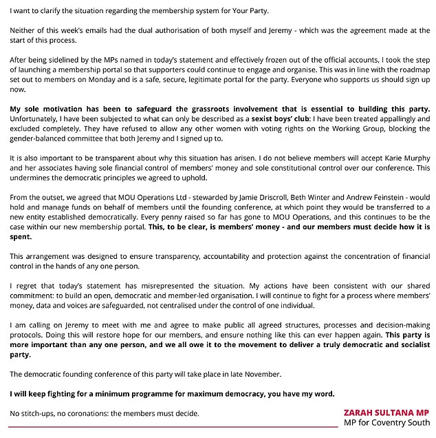 Ms Sultana shared her statement on social media shortly after Mr Corbyn posted his “urgent message” to Your Party supporters around 2pm on Thursday.