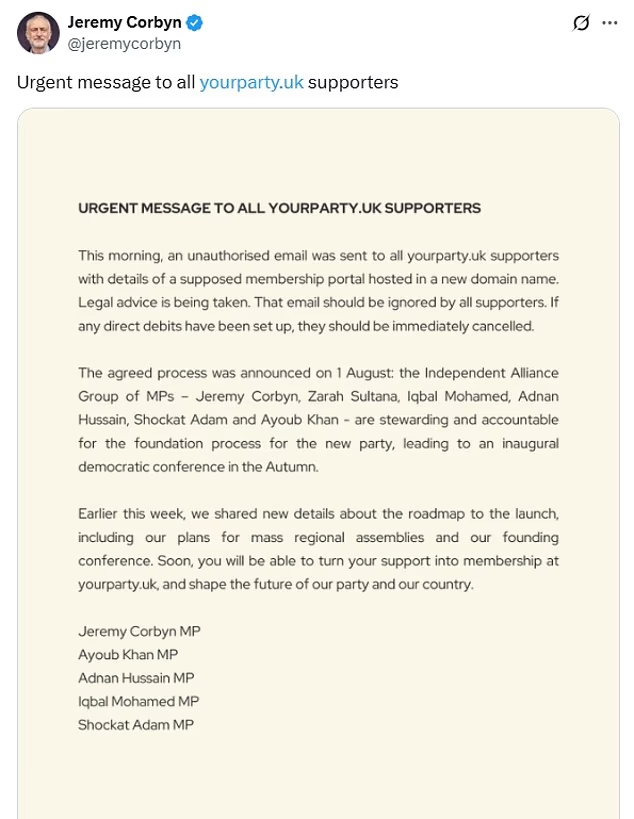 It read:Â “This morning, an unauthorised email was sent to all yourparty.uk supporters with details of a supposed membership portal hosted in a new domain name.