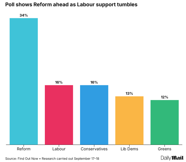 The latest sign of manoeuvres against Sir Keir came as a poll put Labour on its lowest ever support of just 16%. The Find Out Now research found Reform was way ahead on 34% backing – although the firm has consistently detected bigger advantages for Nigel Farage’s party than other pollsters.