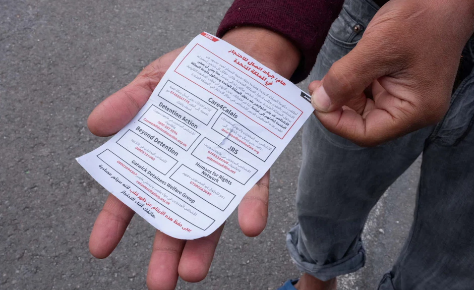 The leaflet then lists the contact details of Care4Calais, as well as five other migrant charities: Detention Action, the Jesuit Refugee Service, Beyond Detention, Humans for Rights Network and Gatwick Detainees Welfare Group.
