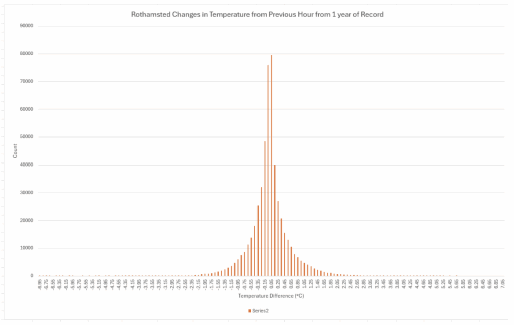 The main takeaway from this new crucial scientific evidence is that many daily maximum temperature spikes at Met Office stations are not genuine weather events but artefacts arising from careless, bad or even intentionally poor siting. At Rothamsted, changes from minute to minute follow a predictable natural pattern, with the vast majority of the 525,541 readings varying from -0.15°C to 0.25°C. Individual changes from the previous hour show an expected wider spread and, depending on the season, vary over the majority of the readings from around -0.35°C to 0.45°C. To give an idea of how dreadful some of Met Office data is, consider its declaration that the hottest ever UK May 1st temperature of 29.3°C was recorded this year in the urban heat jungle of Kew Gardens. The measurement occurred at 2.59pm and was no less than 2.6°C higher than at 2pm and 0.76°C above the 3pm mark – whatever was being recorded on that day, it is highly unlikely that it was the ambient natural air temperature.