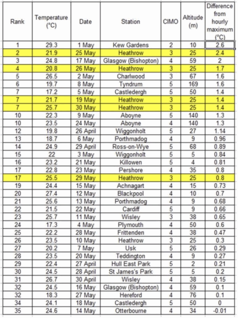 These two graphs show the variation of natural air temperature when it is measured properly under credible scientific conditions. The following table from earlier Huxter’s work shows how large the distortions can be when Met Office daily maximums, or ‘extremes’ as they are categorised, are drawn from badly sited stations. Listed below are 35 daily highs starting on April 26th this year and the difference from the recording at the hour. All but one of the recordings arise from CIMO Classes 3, 4 and 5, with internationally recognised ‘uncertainties’ up to 1°C, 2°C and 5°C respectively. The overall average ‘spike’ is 0.89°C, which is far higher than the overall average at Rothamsted.