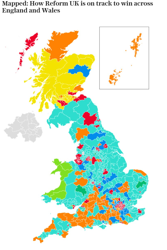 Previously they have been pushed by the establishment parties to make it seem pointless to vote for other parties (“why waste your vote?”), but that could seriously backfire as it looks like Reform have a serious chance of forming the next government.