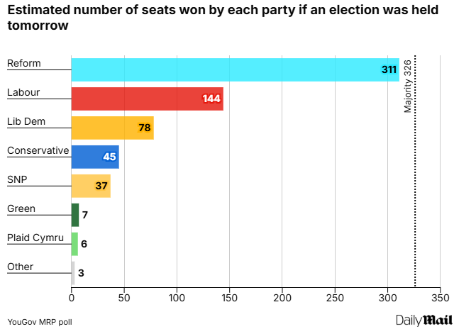 A major poll has put Nigel Farage on track to be Britain’s next Prime Minister with 311 MPs as Labour is set to lose more than 250 seats and the Tories are pushed into fourth. The Mail has more.
