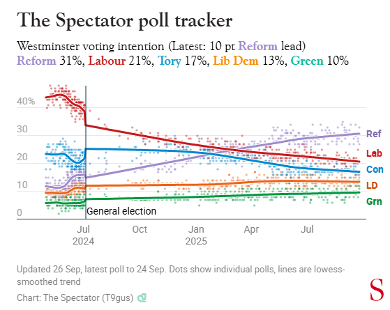 Indeed, in keeping with YouGov’s infamous ‘pro-social’ (or Left-wing) bias, 27% is on the low side for Reform: the party’s current polling average is 31%.