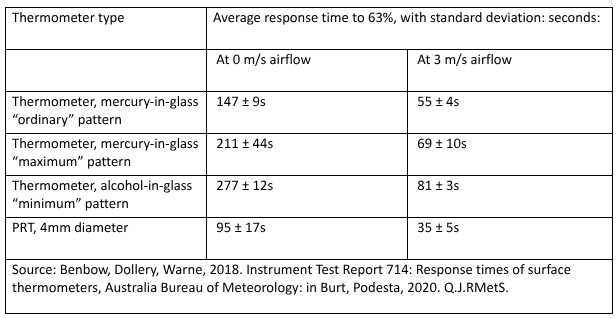 To see the significance of this, the response time of the different instruments can be assessed. As can be seen from the table below, the PRTs have a faster response time than the glass equivalent ones, with the larger difference being at very light wind speeds. The Stevenson Screens are only naturally aspirated, which means thermometers are recording at the lower wind speeds and so response times are longer. It seems likely that the change from the glass thermometers to the PRTs has an impact upon climate returns.