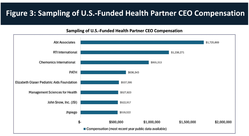 A graphic from the strategy showing CEO salaries from some of the major agencies that have managed US health aid for the past couple of decades gives an idea of the problem that the US administration must address. There is simply no justification for individuals to receive multiples of the US President’s salary to distribute US aid to poor people. It’s not just CEOs. Other senior executives in US-funded NGOs and foundations can also take home several hundred thousand per year, and whole new campuses have been built in Geneva, one of the most expensive cities on earth, to house their staff.