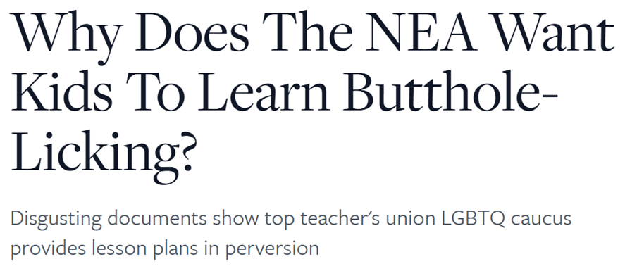 In 2022, lesson-plans were leaked online, endorsed by the queer caucus of the main US teaching union, the NEA, called ‘Sex Acts That Don’t Get Enough Play’. A video showed footage of adolescent schoolchildren forced to wear large labels across their chests with the names of lesser-spotted sex-acts like “RIMMING” (licking out arseholes with one’s tongue), in order to combat a sort of societally maintained ‘sex-racism’ against such practices. Other kids would approach the ones wearing the labels and ask what their teacher-assigned fetish was all about. If they liked the sound of it, the newly-formed couple could then disappear behind the bikesheds and begin practising upon one another, most likely.