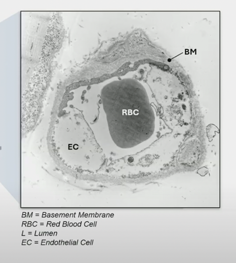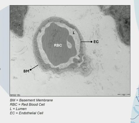 In relation to the hypoperfusion (reduced blood flow), one issue concerns a dysfunction within the capillaries supplying the muscle tissues. In ME, the outer layer of the capillaries – the basement membrane – has become significantly thicker. This creates a kind of barrier that lowers oxygen transfer into the muscles. These changes have been identified under electron microscopy and you don’t need to have a medical degree to spot the difference between a healthy capillary and one with ME: