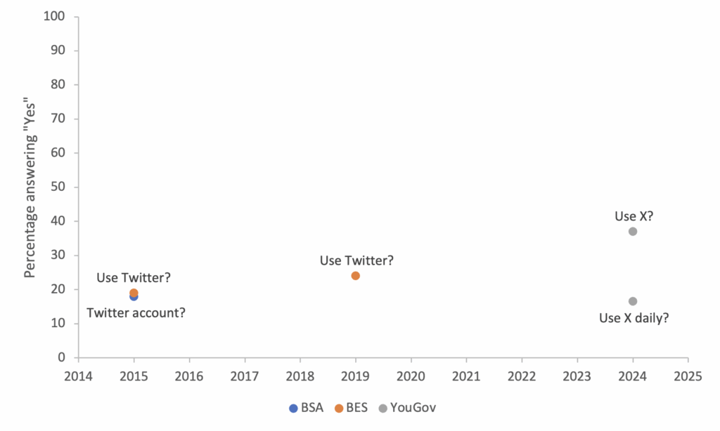 The chart below plots several estimates of the percentage of the UK population that uses the platform. Because they correspond to different questions asked in different surveys, they are not directly comparable. The 2015 estimate labelled in blue comes from a paper published in Social Media + Society. The 2015 estimate labelled in orange comes from a paper published in Research & Politics. The 2019 estimate comes from my own analysis of the British Election Study. And the 2024 estimates are based on two YouGov polls (a simple average was taken).