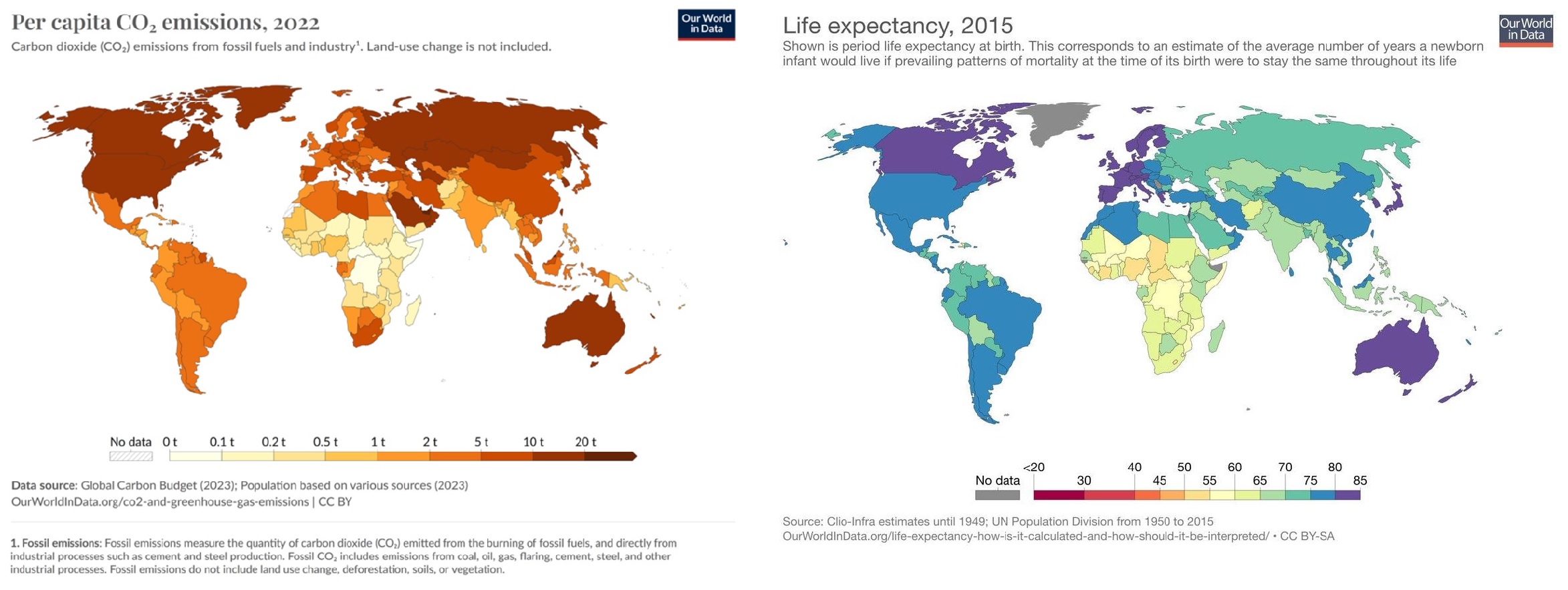 Below are 2 maps from OWID showing per capita CO2 emissions (left) and Life Expectancy (right). Well who’d of thought? The countries with greater CO2 ’emissions’ have greater life expectancy.