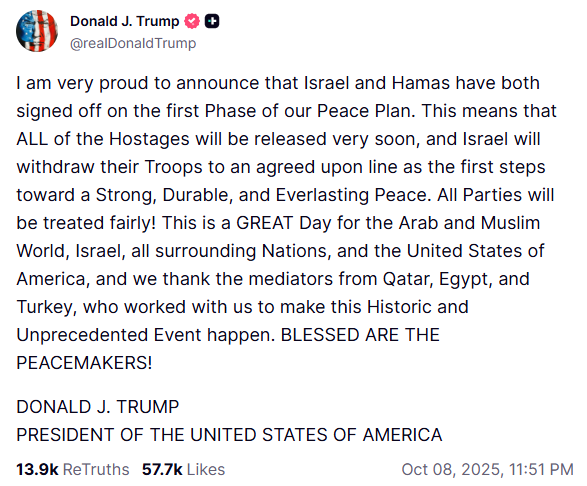 The deal, signed in Egypt at 10am BST, will lead to a pause in the fighting, the release of all 20 living hostages in a matter of days and an Israeli military withdrawal from the majority of Gaza.