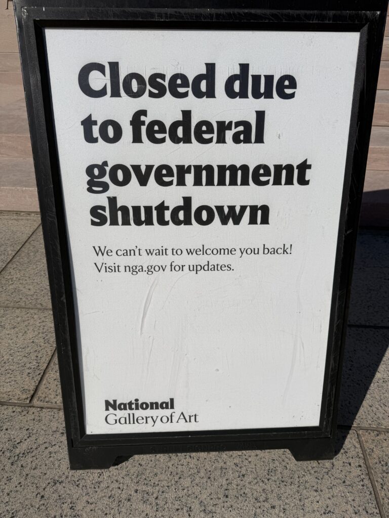 Which brings me to DC, where I have spent the weekend. Businesses are functioning normally, but the Washington Mall is eerily quiet, with the Smithsonians and all government buildings firmly closed. Absolutely nobody is permitted to enter these buildings, and, walking back to our hotel past one of the Federal Tax buildings, water was gushing from a room high up and pouring onto the street, causing a small flood. Clearly, there was a plumbing problem which was not going to be fixed until the shutdown lifted.