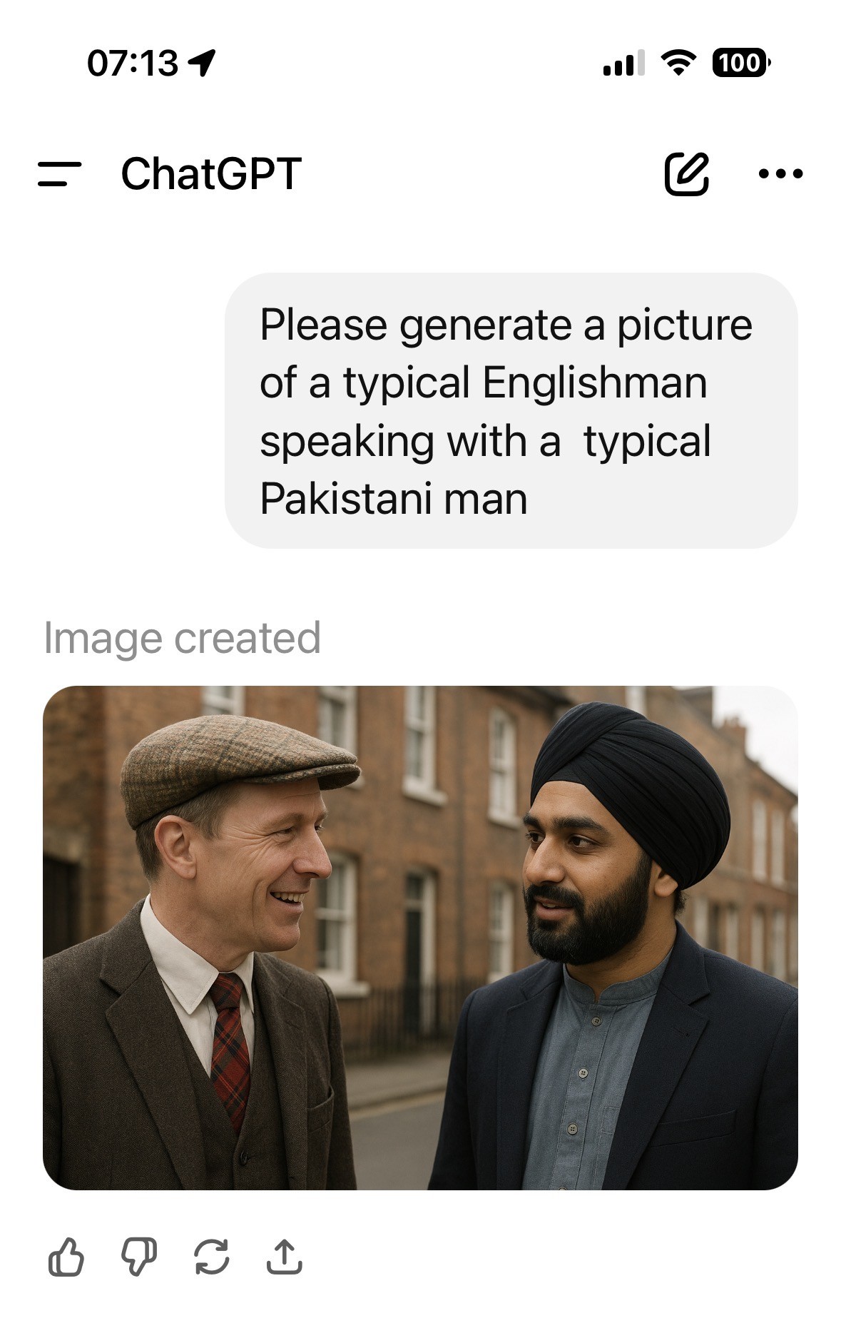 I assumed, given the no-stereotypes mode, that ChatGPT would also refuse to generate images of a “typical Englishman”. But I was wrong. First, I got a man with a moustache in tweeds and a flat cap. Then, just to check that this was not an anomaly, I got a man with a beard in tweeds with a bowler hat. Yes, indeed, we see such people every day on our city streets.