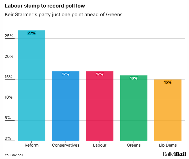 This put Sir Keir’s party level with the Tories (17%), just one point ahead of the Greens (16%), and two points ahead of the Liberal Democrats (15%).