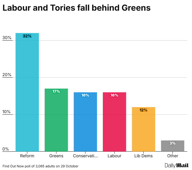 Labour and the Tories are behind the Green Party for the first time, a stunning poll has found, as Reform continues to ride high on 32%. The Mail has the story.