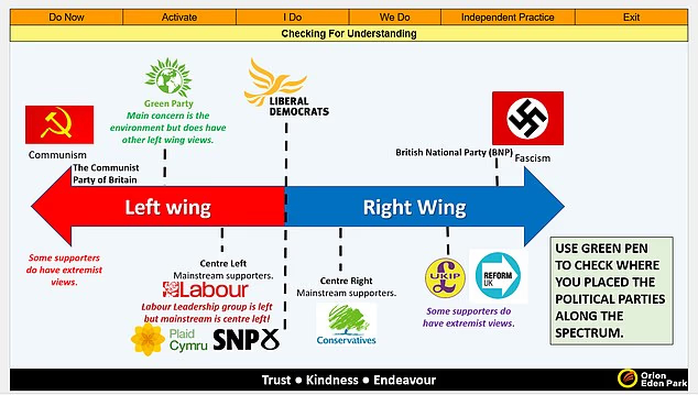 The materials also placed Reform to the right of UKIP and next to the BNP and the Nazis at the “fascism” end of an illustration on the Left-wing/Right-wing political spectrum of beliefs.