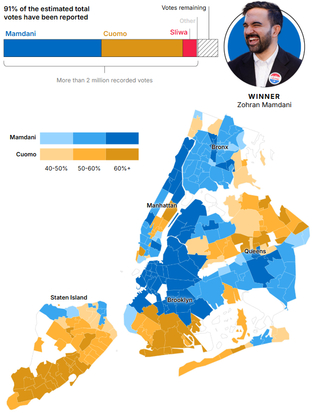 Mamdani, who becomes the Big Apple’s first Muslim mayor, defeated former New York State governor Andrew Cuomo and Republican Curtis Sliwa in a race that became a massive flashpoint in national politics, taking over 50% of the vote.
