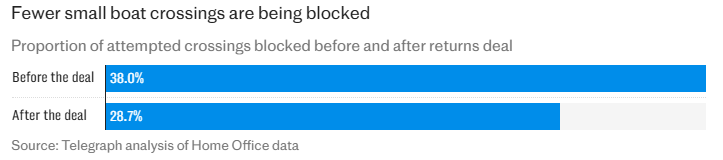 This contrasts with the 38% of migrant crossings the French prevented in an equivalent 13-week period before the ‘one in, one out’ deal was struck with France, according to an analysis of official data.