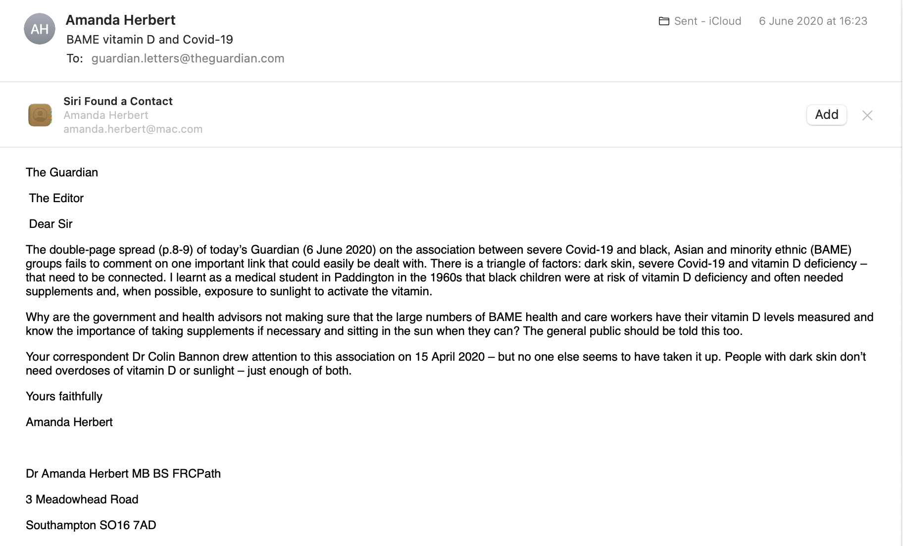 I agree with Dr Bamnji but should add the need for pathologists! In 2020 I was recently retired as a pathologist (Dr Amanda Herbert) specialising in diagnosis, screening, and keeping people alive rather than finding out why they died — and believed that many lives were lost by not treating people with dark skin with Vitamin D — which was regarded as a ‘racist’ thing to say. Back in the day when I read the Guardian, I wrote the attached letter explaining this fact. Needless to say it was not published — so here goes at this rather late date.