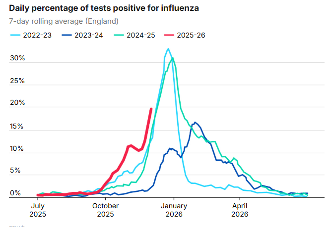Latest data show that the daily percentage of tests positive for flu is 46.9 among those aged five to 14, against rates of between 12.5 and 14.5 in those aged 65 and over. …