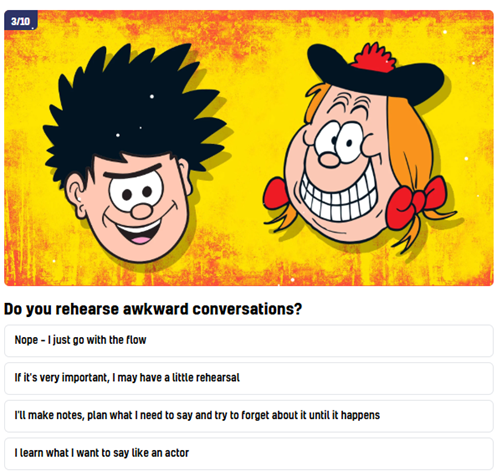 Is there not a danger, however, that by encouraging small children to focus endlessly upon their mental health, you counterproductively end up making previously healthy minds become mentally ill for real? Look at the following Beano mental health quiz query, jointly posed by Dennis and Minnie: