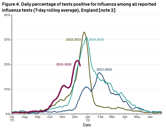 Nothing ‘super’ or out of the ordinary there. Turns out the ‘record-breaking’ levels were just a result of a) short records (only starting in 2021) and b) the outbreak arriving a bit earlier, so levels were relatively high for the time of year (at least, compared with the last four years). But early to rise, early to bed, presumably because there are only so many people prone to catch this particular strain of flu. Which is not a lesson that our public health ‘experts’ ever seem to learn.